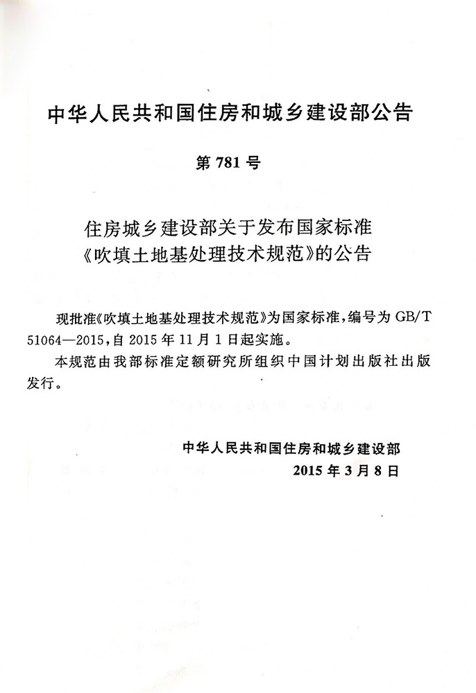 由中华人民共和国住房和城乡建设部、国家质量监督检验检疫总局联合发布的首个固化土相关国家标准《GB/T 51064-2015吹填土地基处理技术规范》已于2015年11月1日正式开始实施,规范内容涵盖固化法的一般规定以及设计、施工、质量检验等各环节,为吹填土地基的固化处理提供了可靠依据。